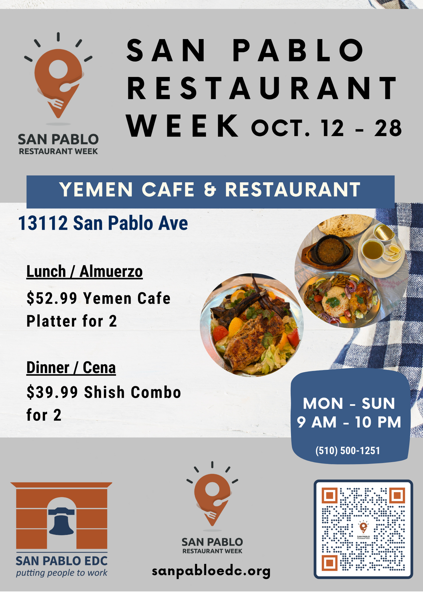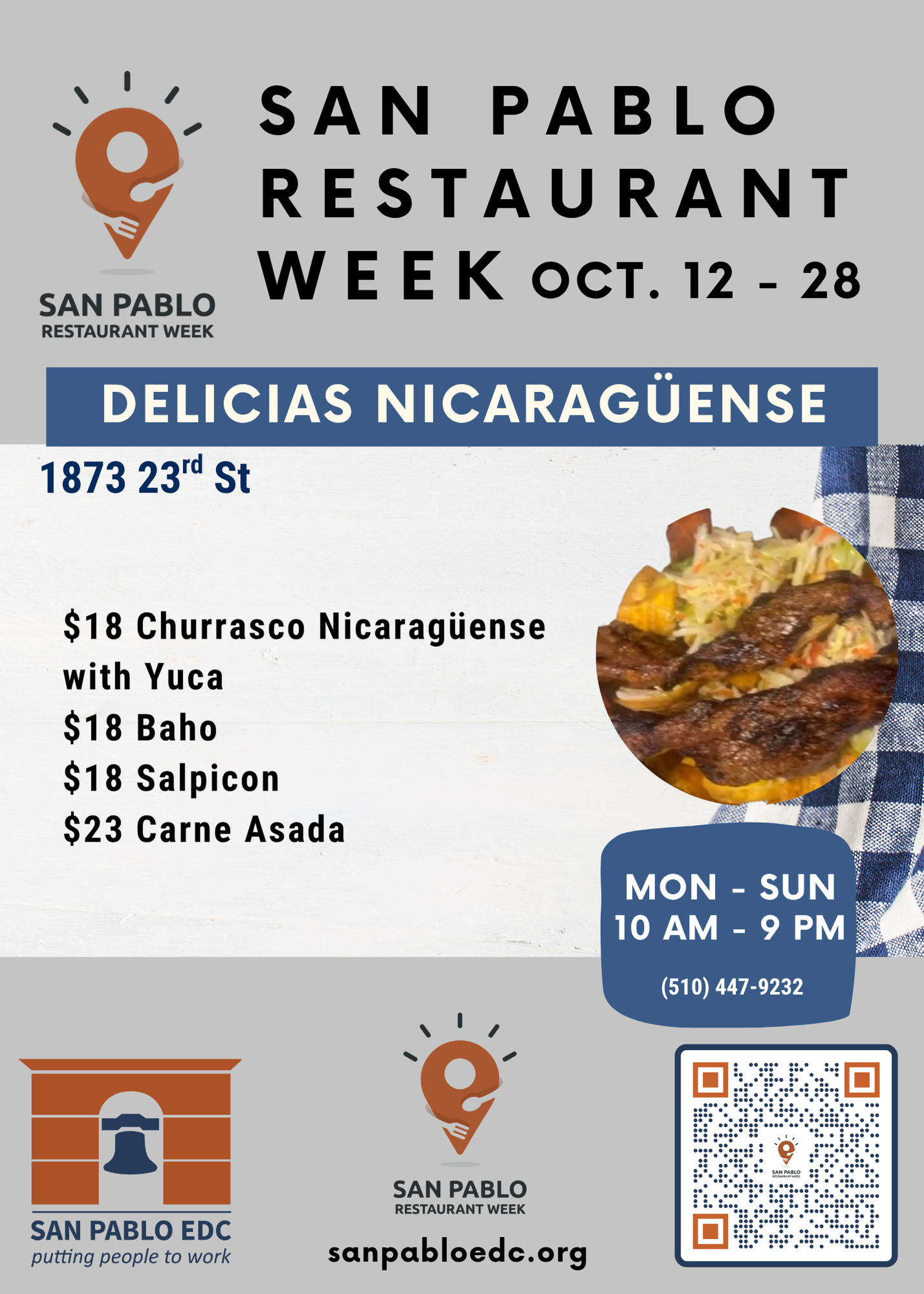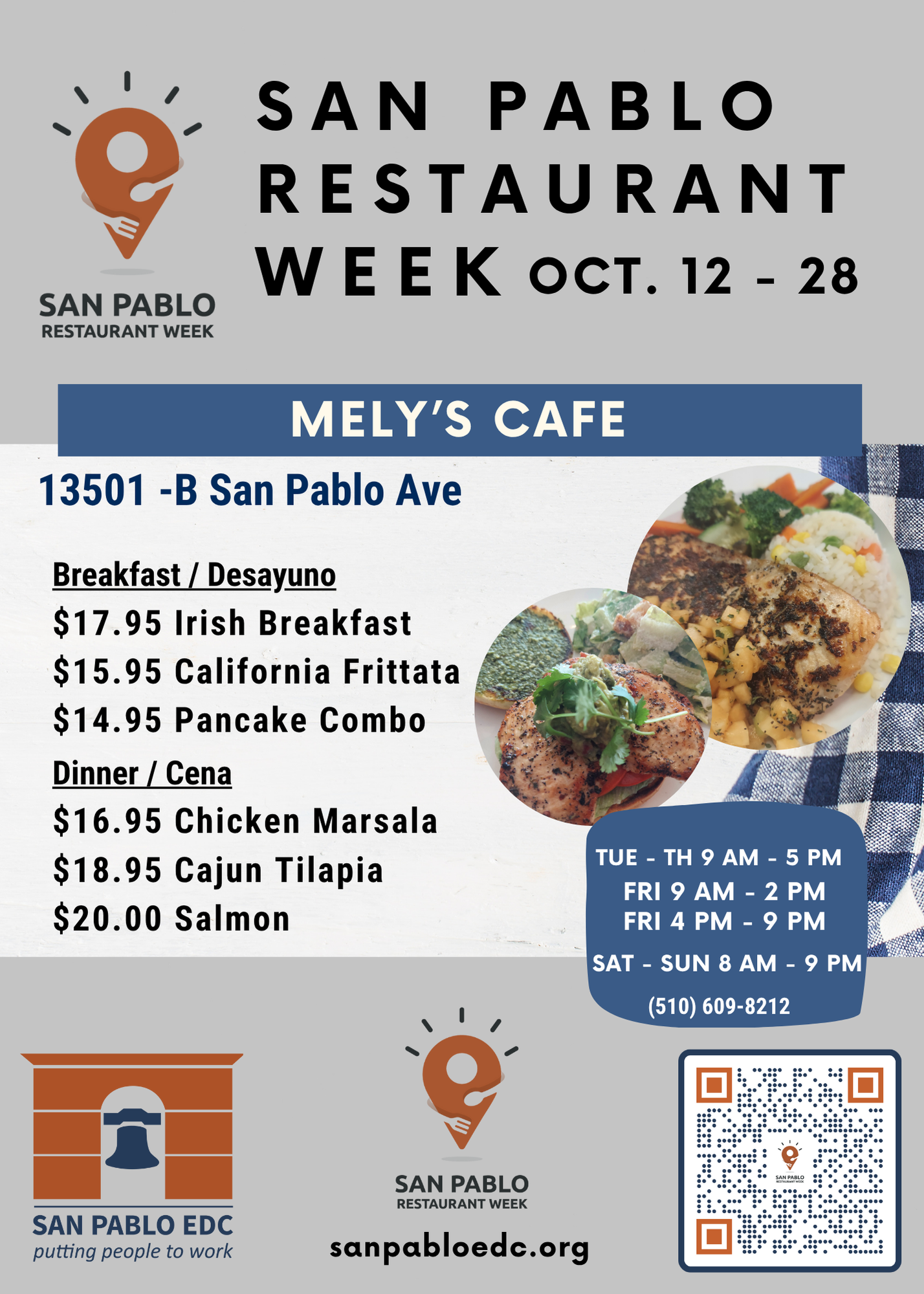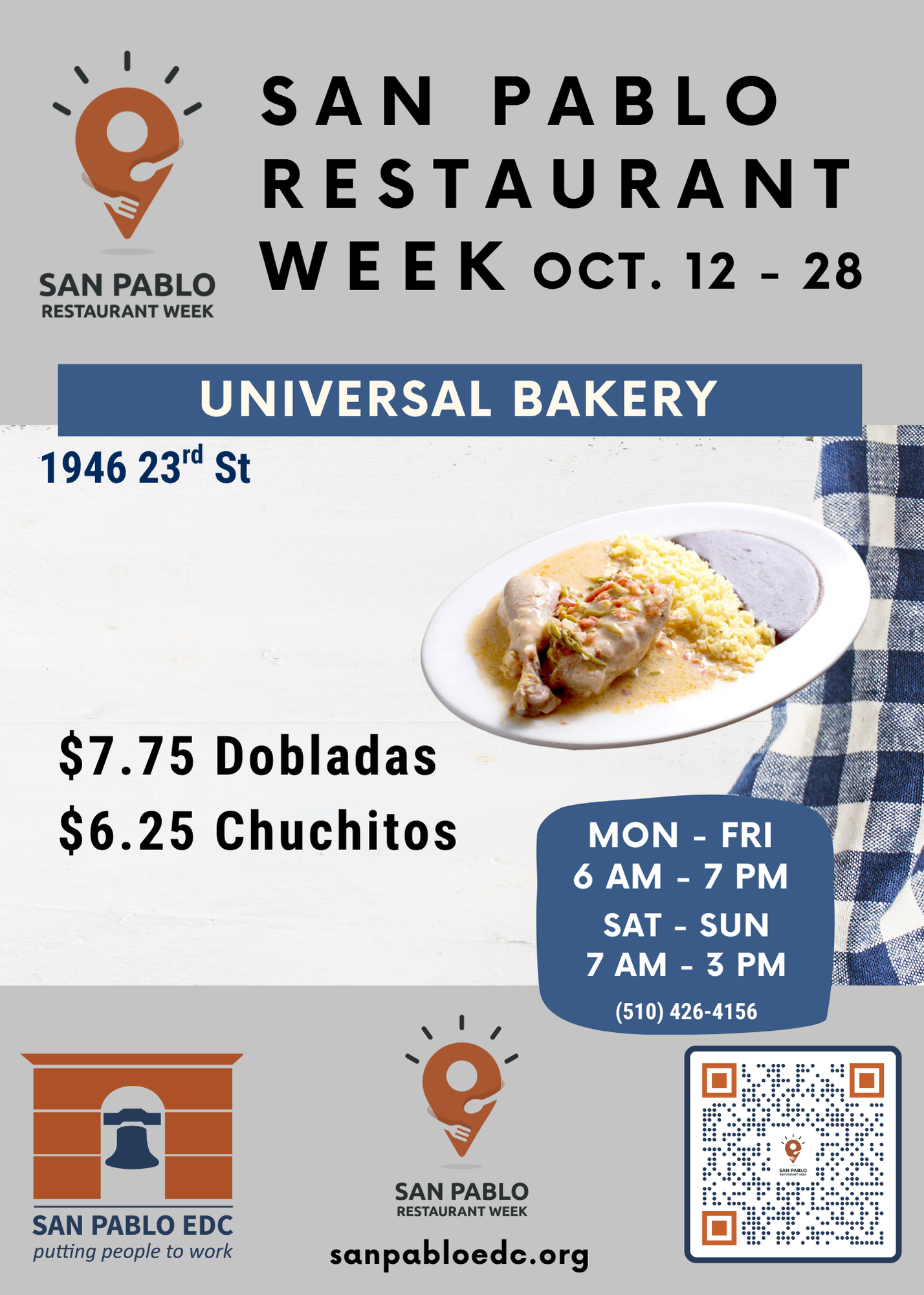 San Pablo Restaurant Week is an event held once a year in which participating restaurants in San Pablo and surrounding neighborhoods offer disounted meals, and celebrates the unique and diverse flavors of our local restaurants. Restaurants are all locally owned, small businesses.