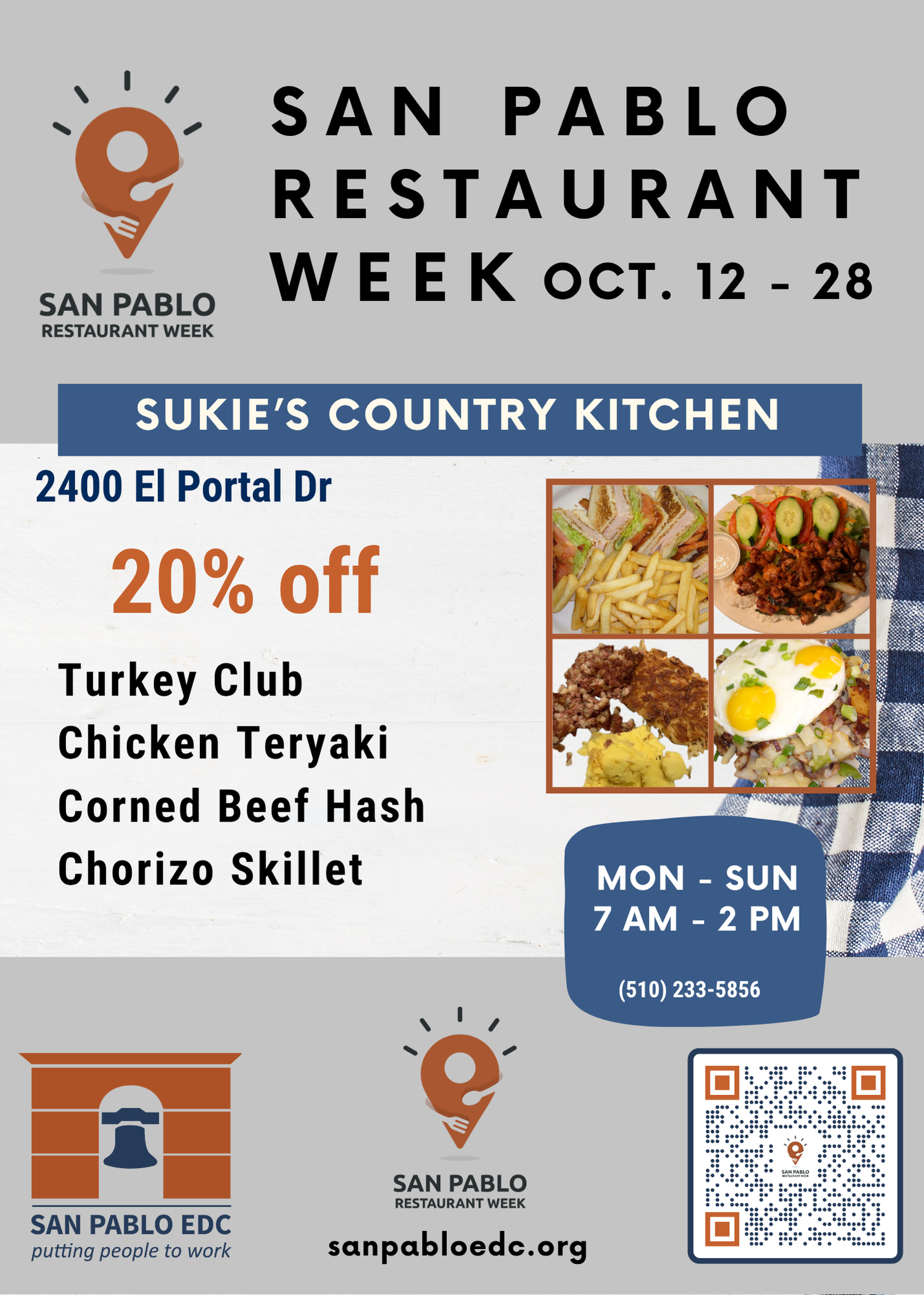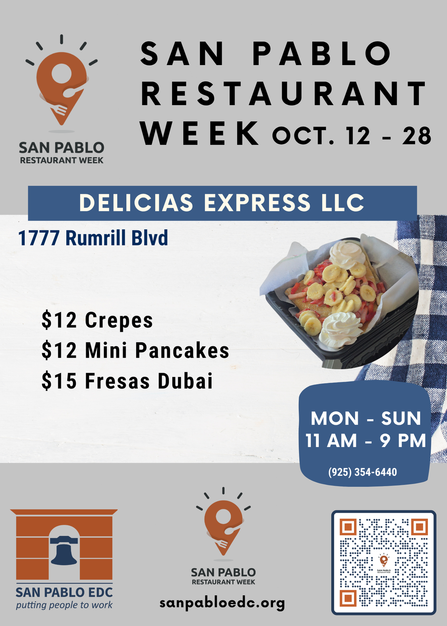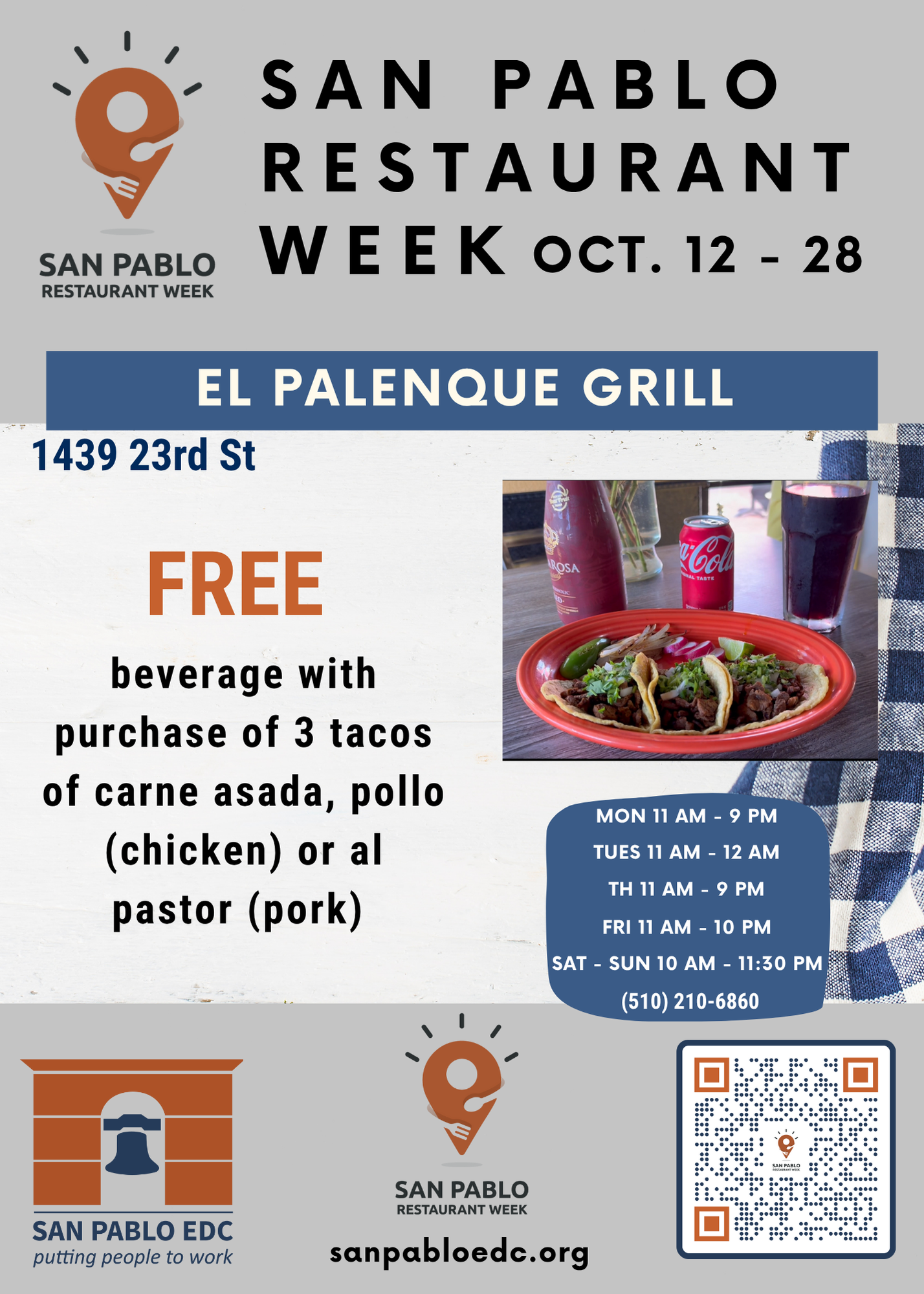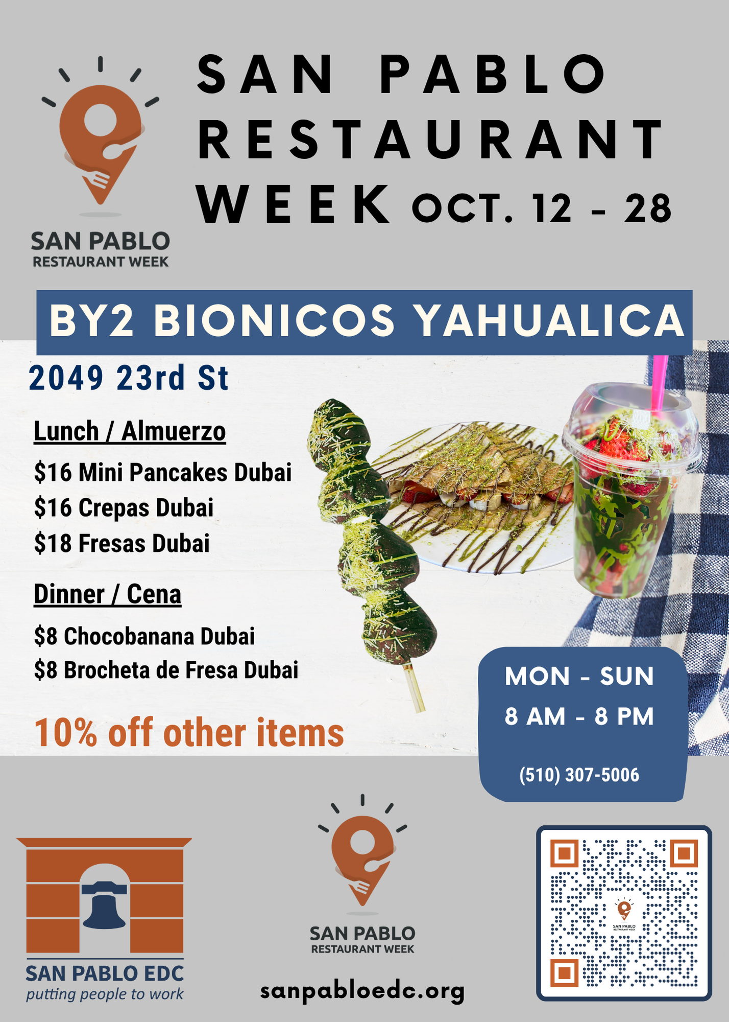 San Pablo Restaurant Week is an event held once a year in which participating restaurants in San Pablo and surrounding neighborhoods offer disounted meals, and celebrates the unique and diverse flavors of our local restaurants. Restaurants are all locally owned, small businesses.