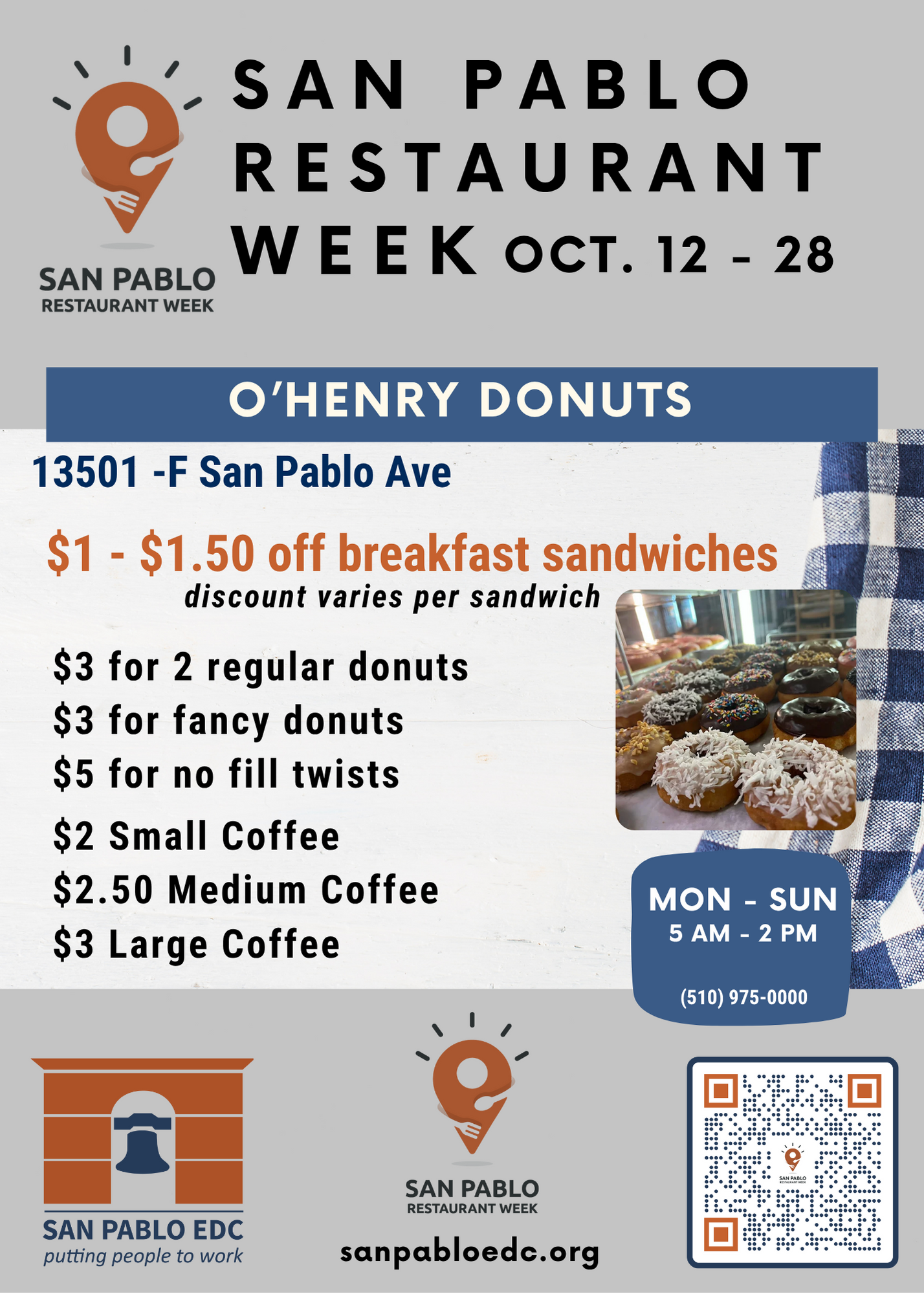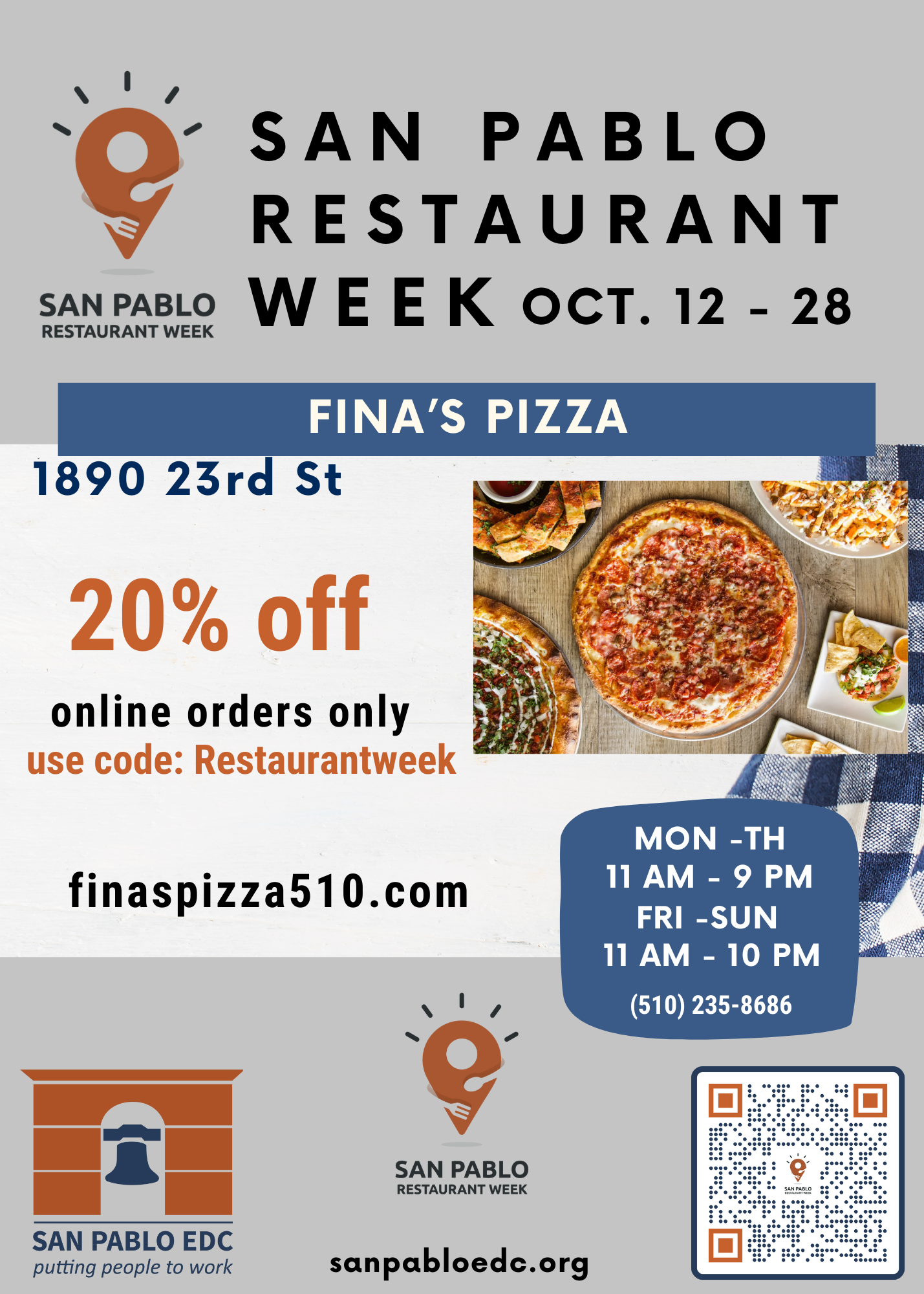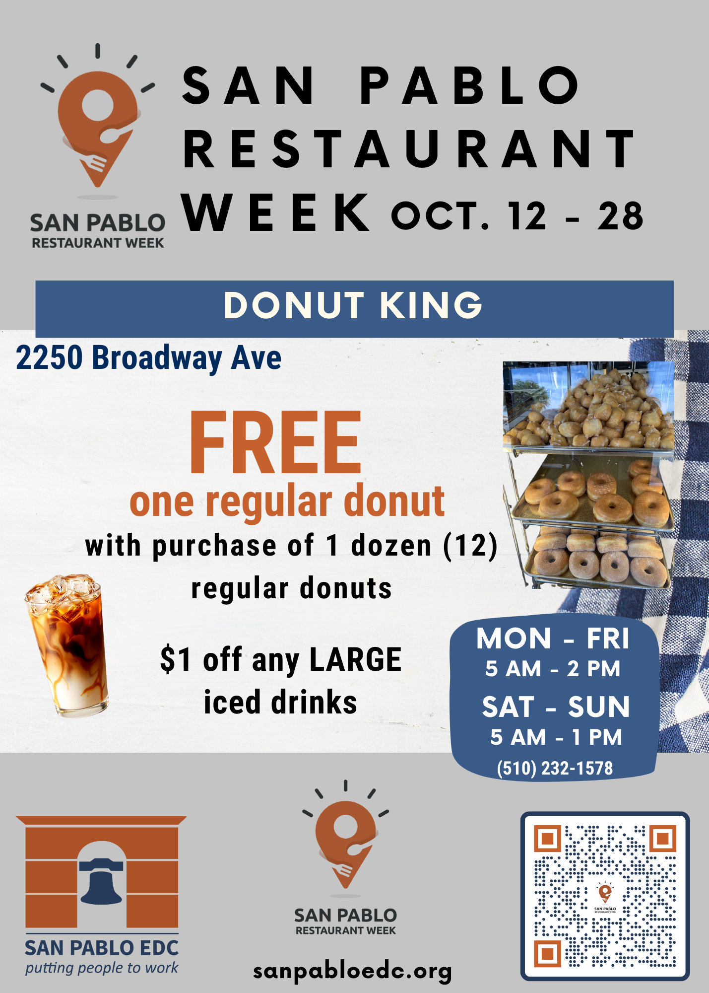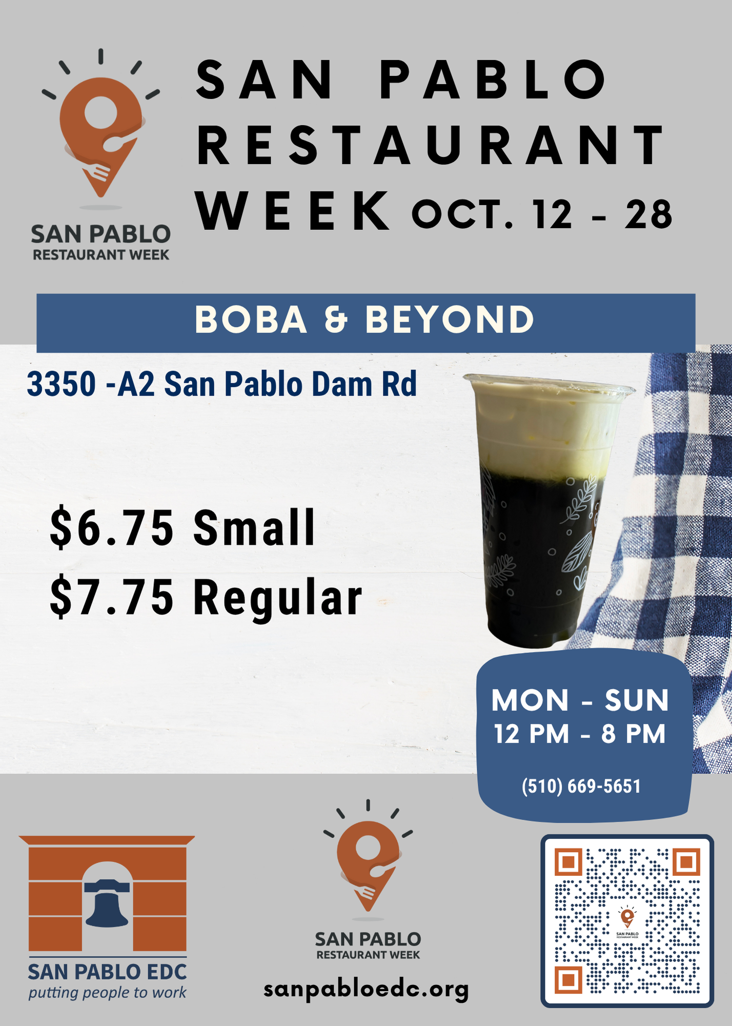 San Pablo Restaurant Week is an event held once a year in which participating restaurants in San Pablo and surrounding neighborhoods offer disounted meals, and celebrates the unique and diverse flavors of our local restaurants. Restaurants are all locally owned, small businesses.